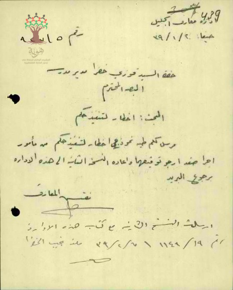 رسالة من مفتش المعارف الى المعلم فوزي الخضرا للتوقيع على نسخة من اخطار لتنفيذ حكم