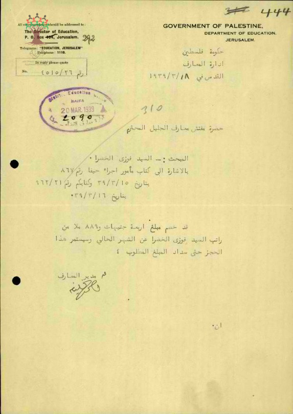 مجموعة رسائل بخصوص خصم ثلث راتب المعلم فوزي الخضرا لسداد الديون