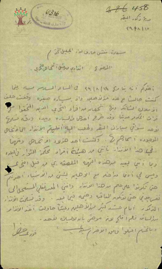رسائل من المعلم فوزي الخضرا الى مفتش المعارف بخصوص انذارين موجهين اليه من اشخاص التحري