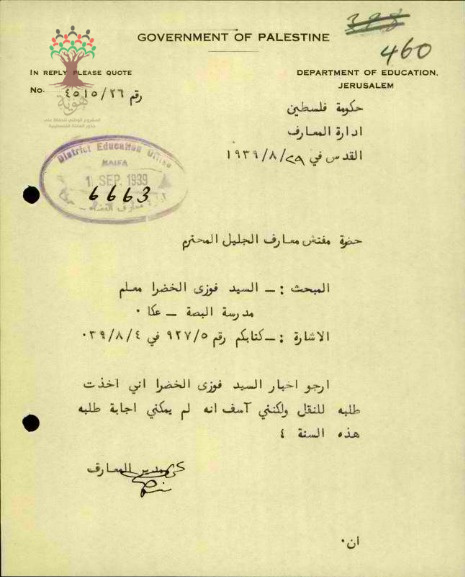 رسالة من مدير المعارف الى مفتش المعارف يخبره بأن لا يمكن نقله في العام الحالي