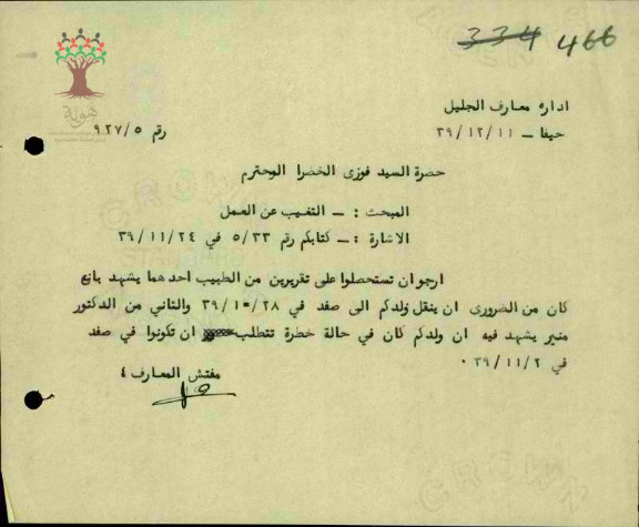 رسالة من مفتش المعارف الى المعلم فوزي الخضرا يطلب منه التقارير الطبية لتبرير غيابه
