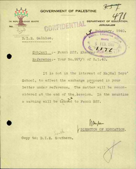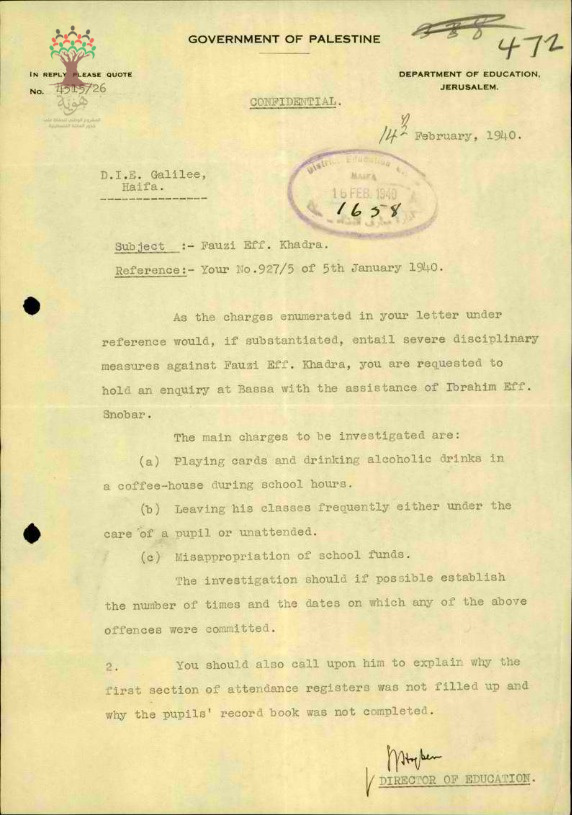 رسائل من مدير المعارف الى مفتش المعارف بخصوص الشكاوى المقدمة ضد المعلم فوزي الخضرا