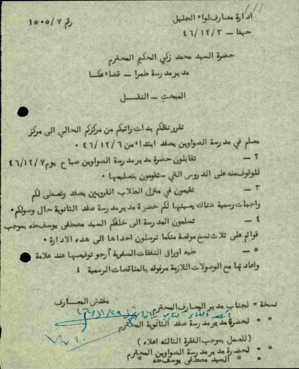 رسالة من مفتش المعارف إلى المعلم محمد زكي الحكيم المبحث النقل إلى مدرسة الصواوين في صفد كمعلم