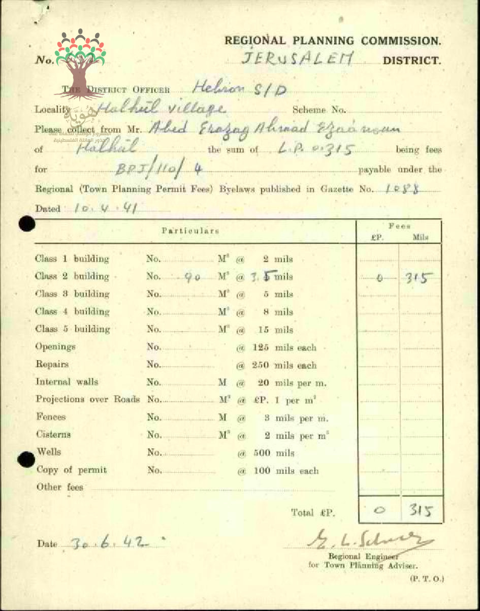 رسوم لطلب رخصة بناء غرفة - عبد الرزاق أحمد الزعنون - حلحول