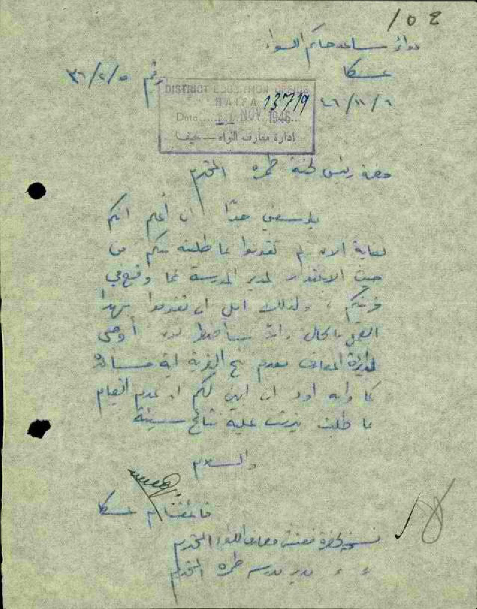رسالة من قائم مقام عكا إلى مفتش معارف الجليل بخصوص عدم الإعتذار من لجنة طمرة لمدير المدرسة