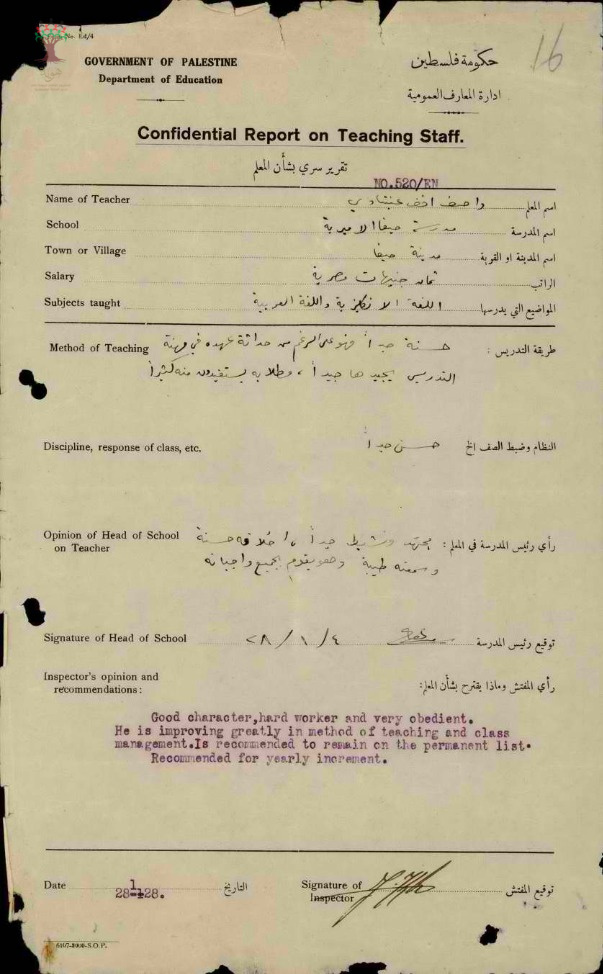 تقرير تفصيلي عن أداء المعلم واصف عنبتاوي في مدرسة حيفا للذكور سنة 1927