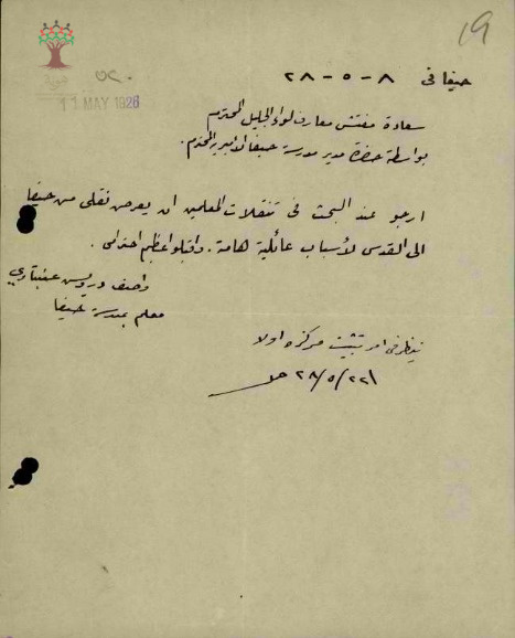رسالة من المعلم واصف عنبتاوي الى مفتش المعارف يطلب فيها نقله من مدرسة حيفا الى القدس