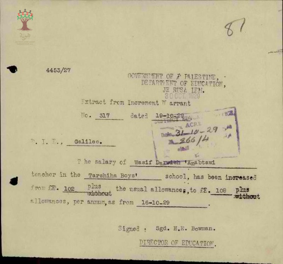 رسالة من مدير المعارف الى مفتش المعارف بخصوص زيادة راتب المعلم واصف عنبتاوي السنوية