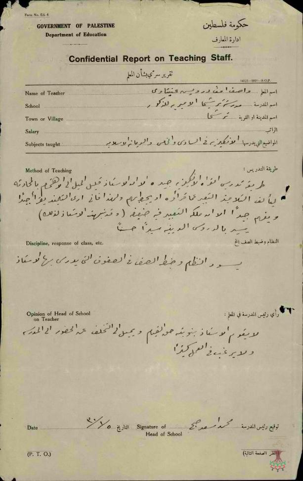 تقرير تفصيلي عن أداء المعلم واصف عنبتاوي في مدرسة ترشيحا للذكور سنة 1930