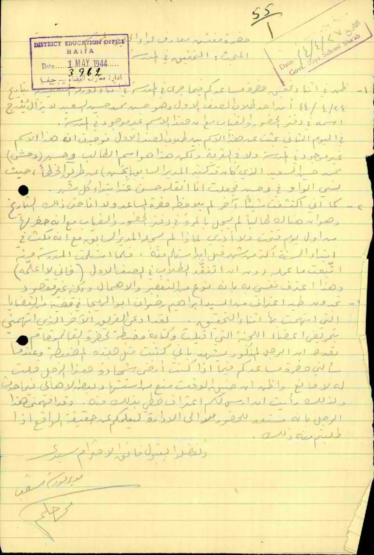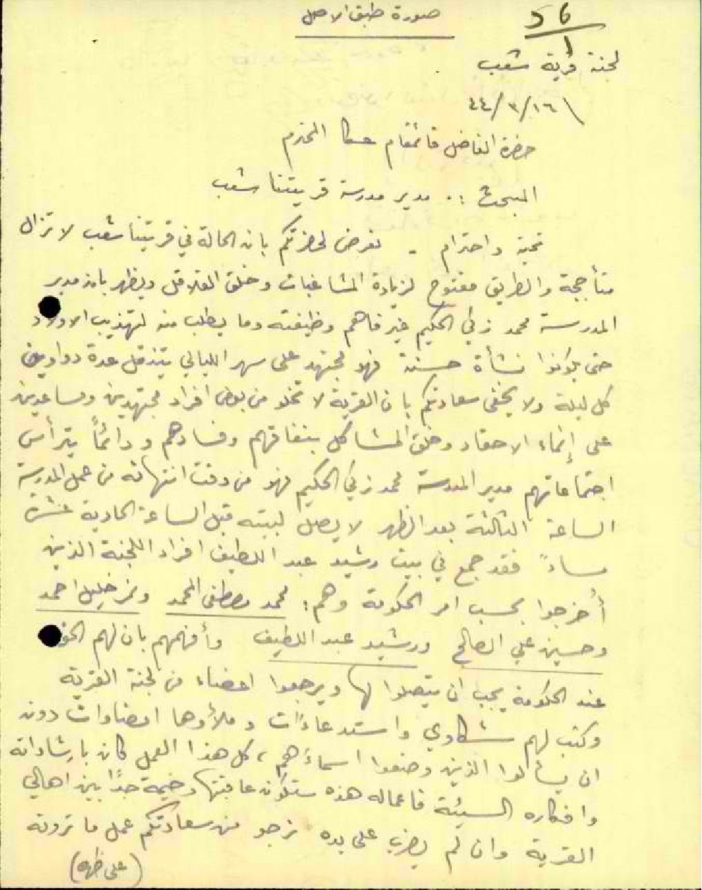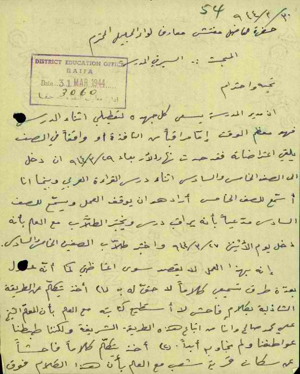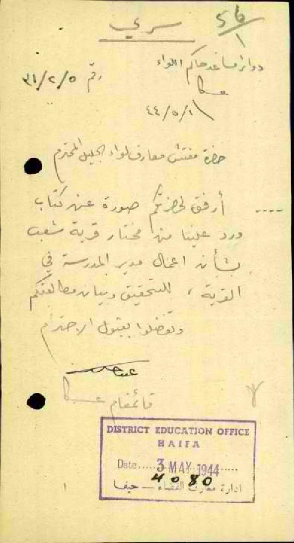 رسالة من قائم مقام عكا إلى -مفتش معارف المحترم -أرفق لكم صورة عن كتاب ورد علينا من مختار قرية شعب - بخصوص أعمال مدير المدرسة