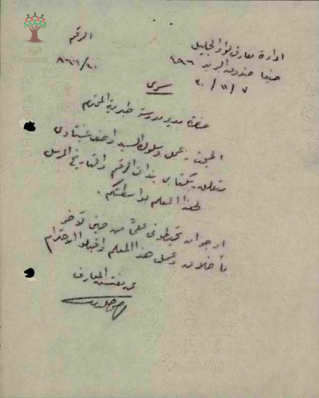 رسالة من مفتش المعارف الى مدير مدرسة طبريا بخصوص سلوك المعلم واصف عنبتاوي