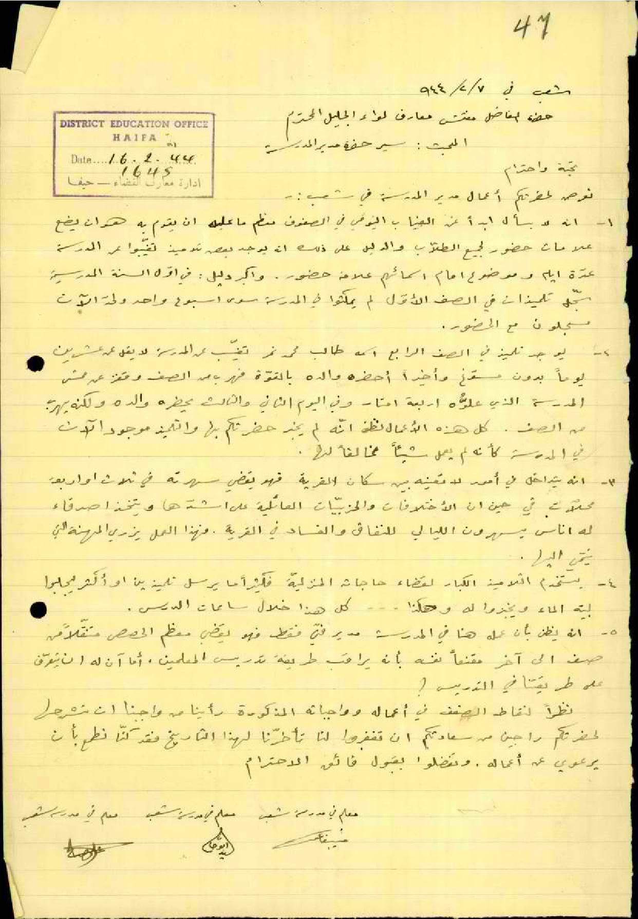رسالة من معلمين في مدرسة شعب إالى مفتش معارف لواء الجليل - المبحث سير حضرة مدير المدرسة