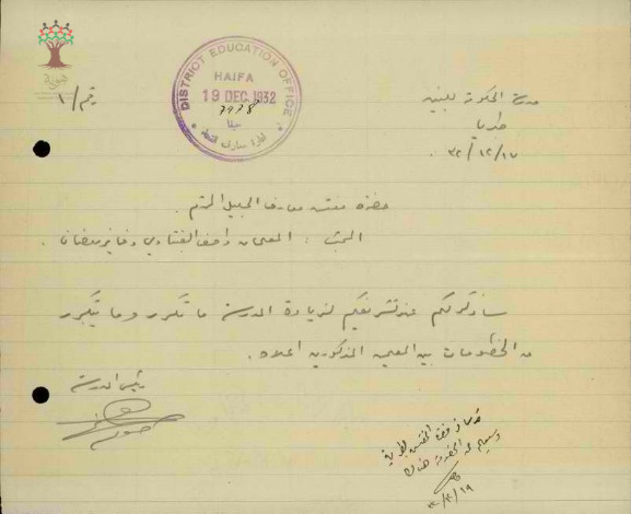 رسالة من مدير مدرسة طبريا الى مفتش المعارف بخصوص مشاكل بين المعلم واصف عنبتاوي والمعلم فايز رمضان