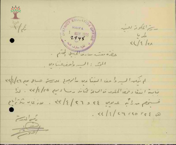 رسالة من مدير مدرسة طبريا الى مفتش المعارف بخصوص الخصم من راتب المعلم واصف عنبتاوي بسبب تغيبه ثلاثة ايام بعد الانتهاء من تقديم الامتحانات