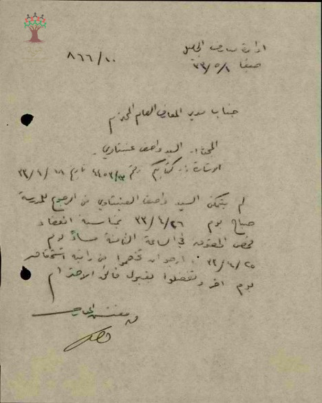 رسالة من مفتش المعارف الى مدير المعارف بخصوص تأخر المعلم واصف عنبتاوي بالعودة الى العمل
