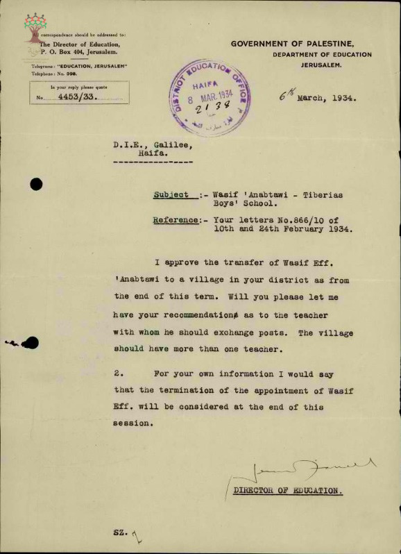 رسالة من مدير المعارف الى مفتش المعارف بخصوص نقل المعلم واصف عنبتاوي من مدرسة طبريا