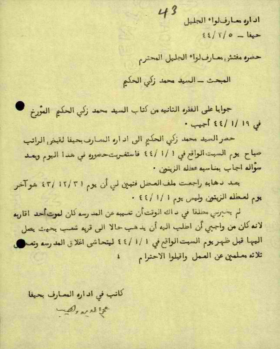 رسالة من كاتب ادارة المعارف بحيفا محي الدين وهيب إلى - حضرة معارف مفتش معارف لواء الجليل - المبحث السيد محمد زكي الحكيم .