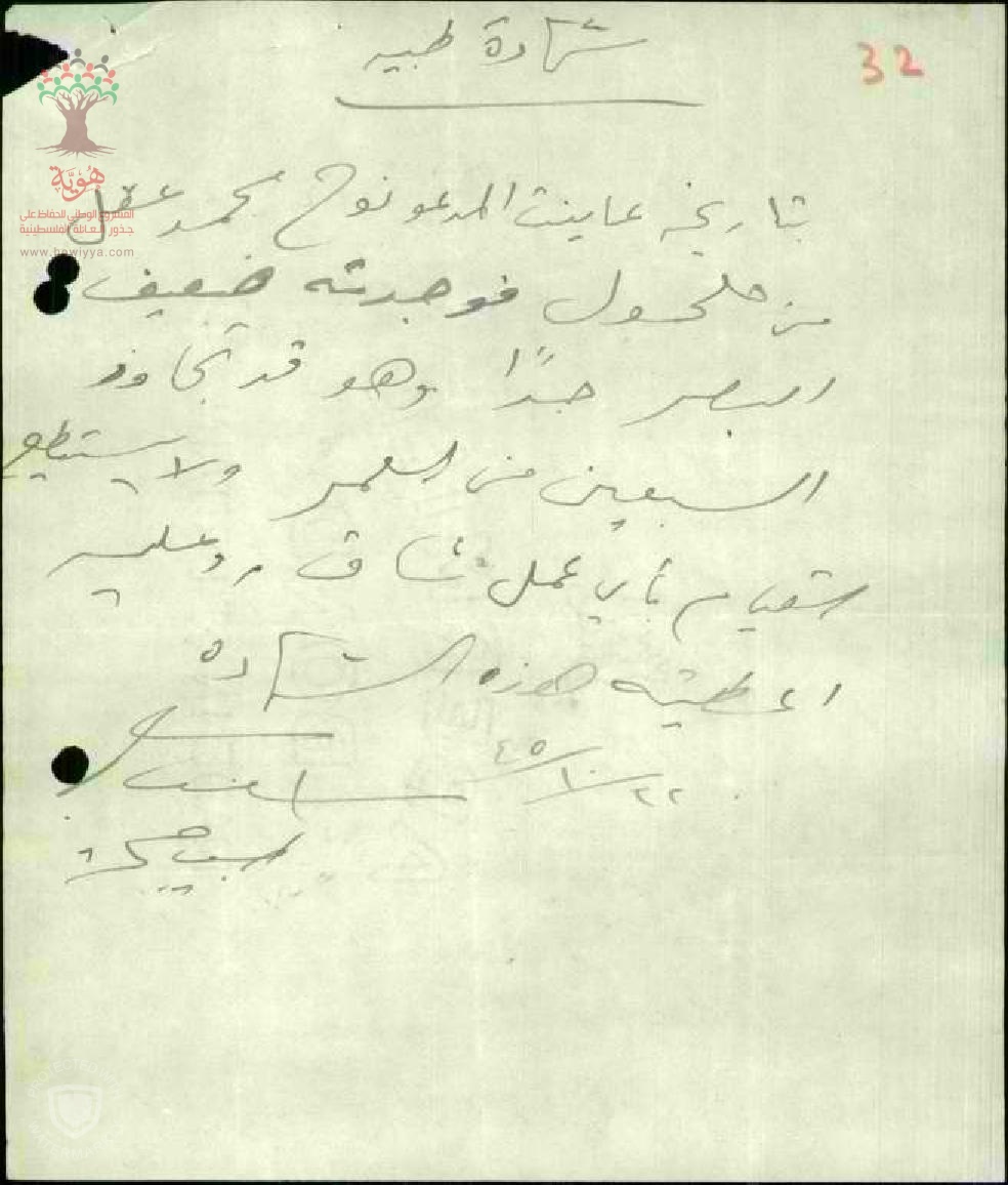 شهادة طبية لـ نوح محمد عقل تفيد بأنه قد تجاوز السبعين من العمر ولا يستطيع القيام بأي عمل