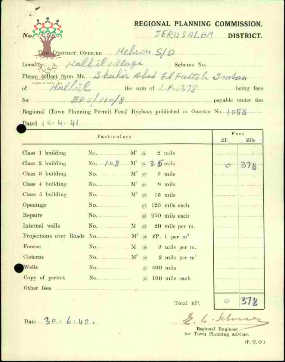 رسوم لطلب رخصة بناء غرفة - شاكر عبد الفتاح عمران - حلحول