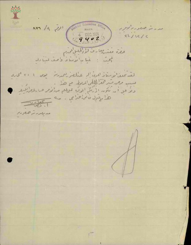رسالة من مدير مدرسة صفورية الى مفتش المعارف بخصوص تغيب المعلم واصف عنبتاوي مرفقة بالتقرير الطبي