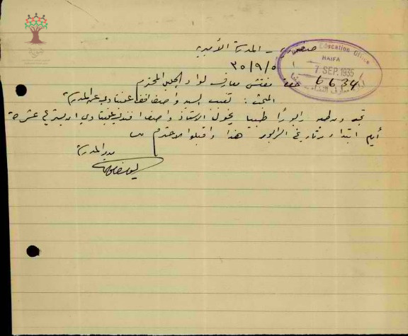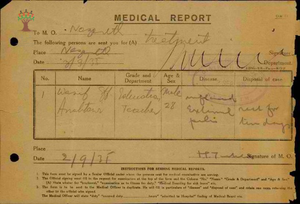 رسالة من مدير مدرسة صفورية الى مفتش المعارف بخصوص تغيب المعلم واصف عنبتاوي مرفقة بالتقرير الطبي
