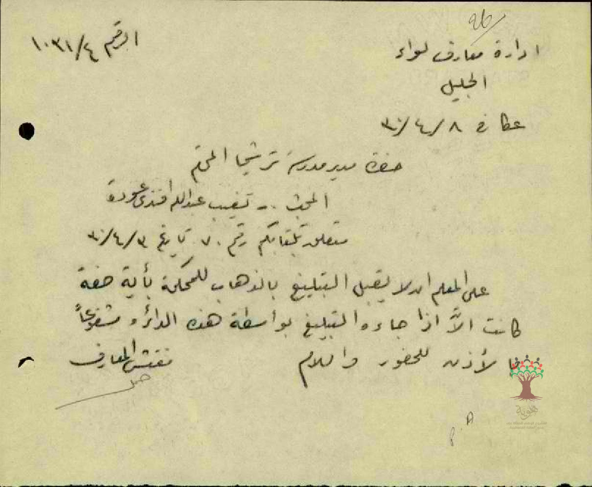 رسالة من مفتش المعارف الى مدير مدرسة ترشيحا بخصوص حضور المعلم عبد الله عودة محكمة صلح عكا