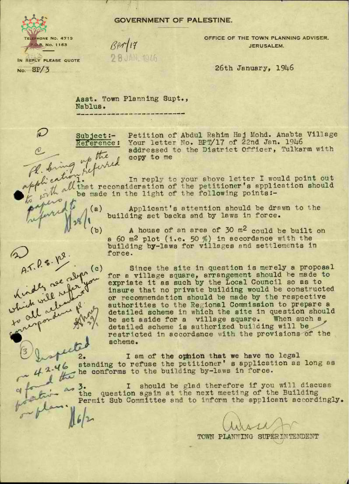 رسالة من مشرف تخطيط المدن إلى مساعد مشرف تخطيط المدن يطلب رخصة بناء للسيد عبد الرحيم الحاج محمد