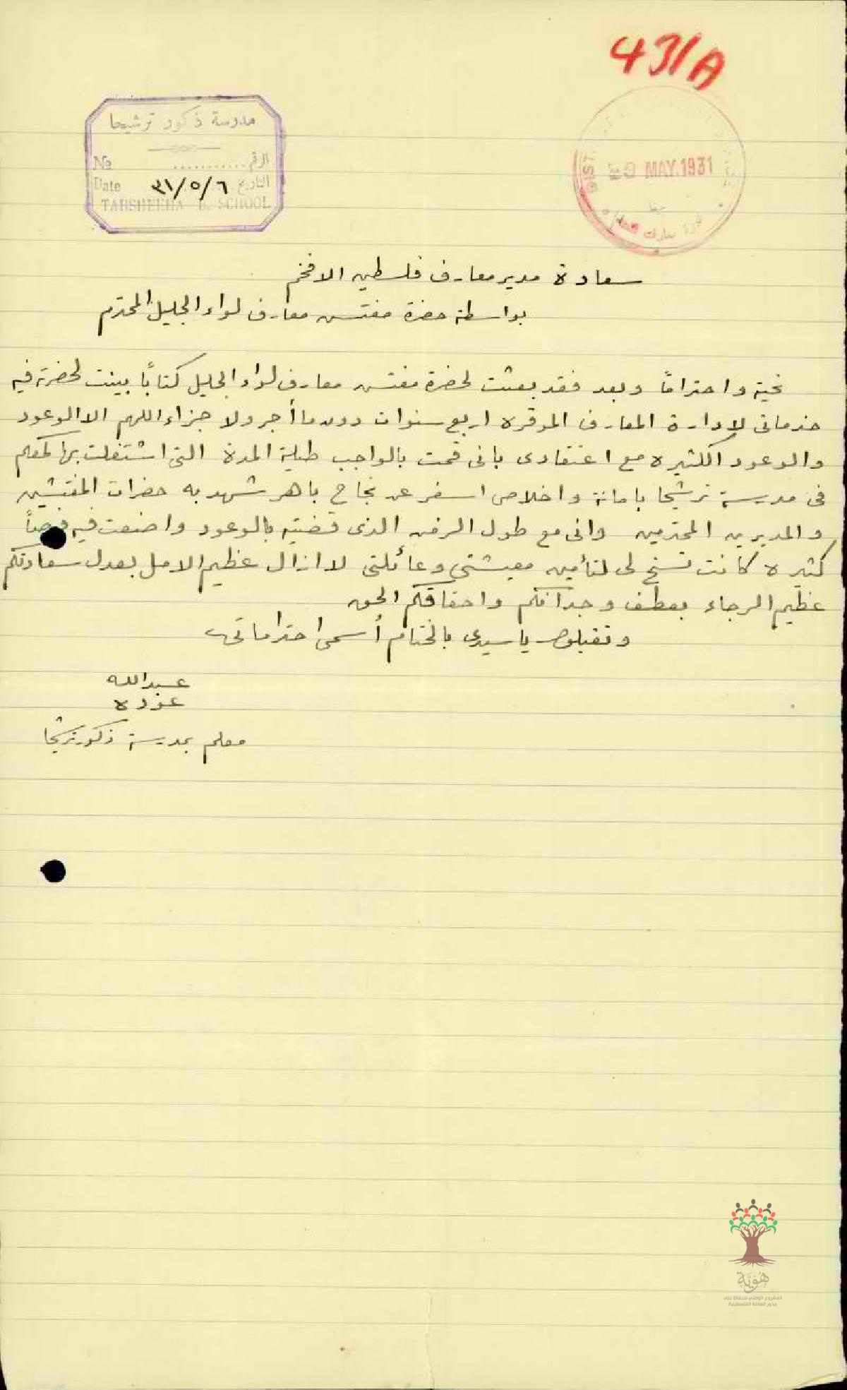رسالة من المعلم عبد الله عودة الى مفتش المعارف يطلب تثبيت راتب مخصص له من الادارة
