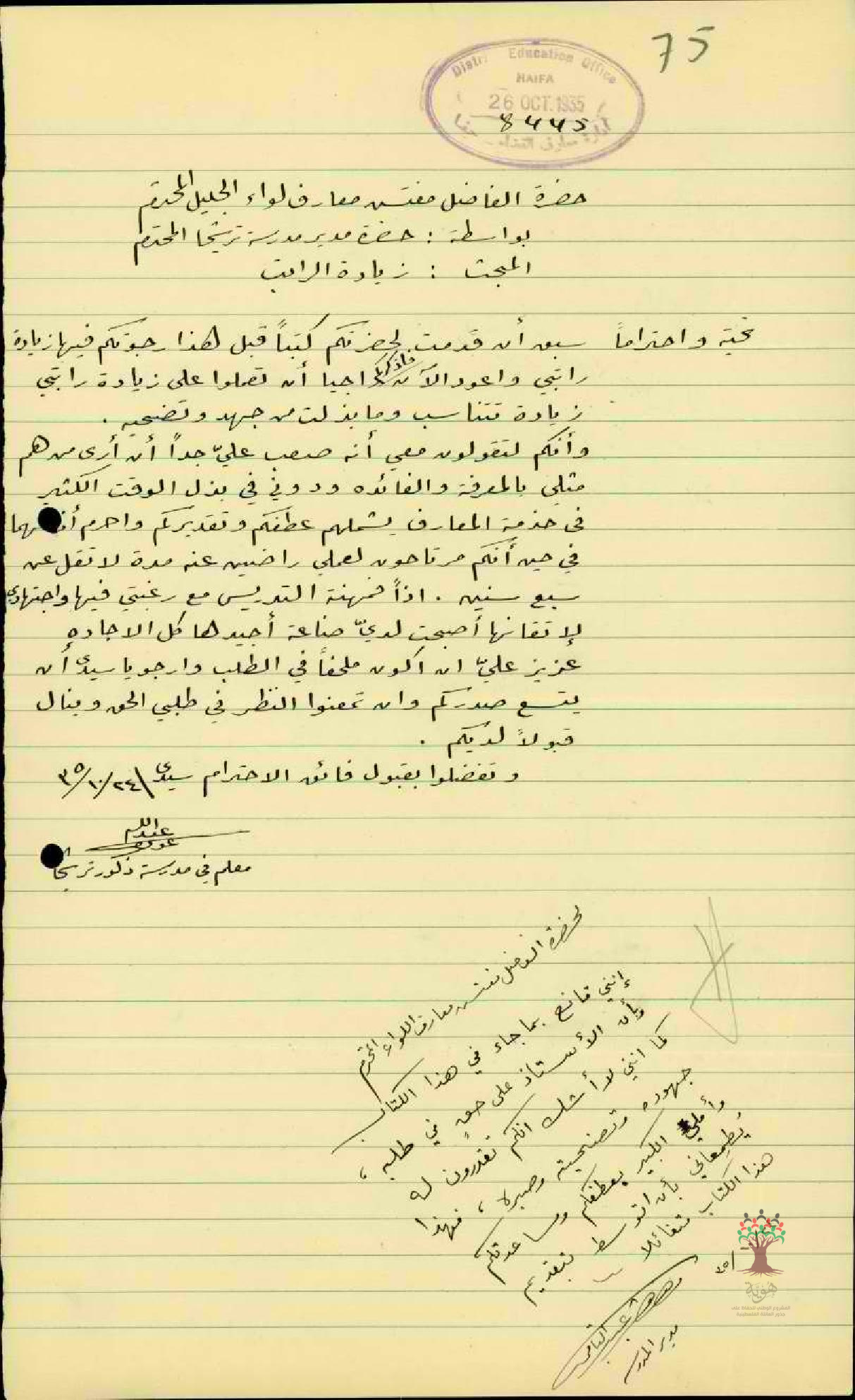 رسالة من المعلم عبد الله عودة الى مفتش المعارف يطلب فيها تحسين راتبه