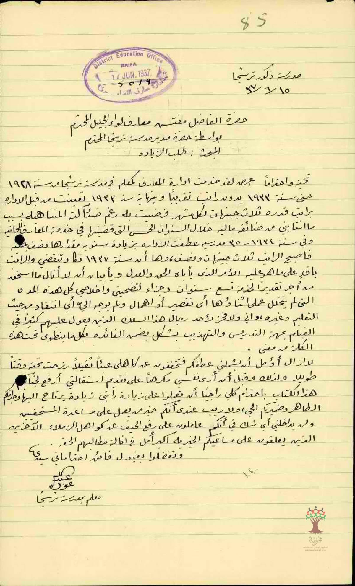 رسالة من المعلم عبد الله عودة الى مفتش المعارف يطلب فيها زيادة راتبه