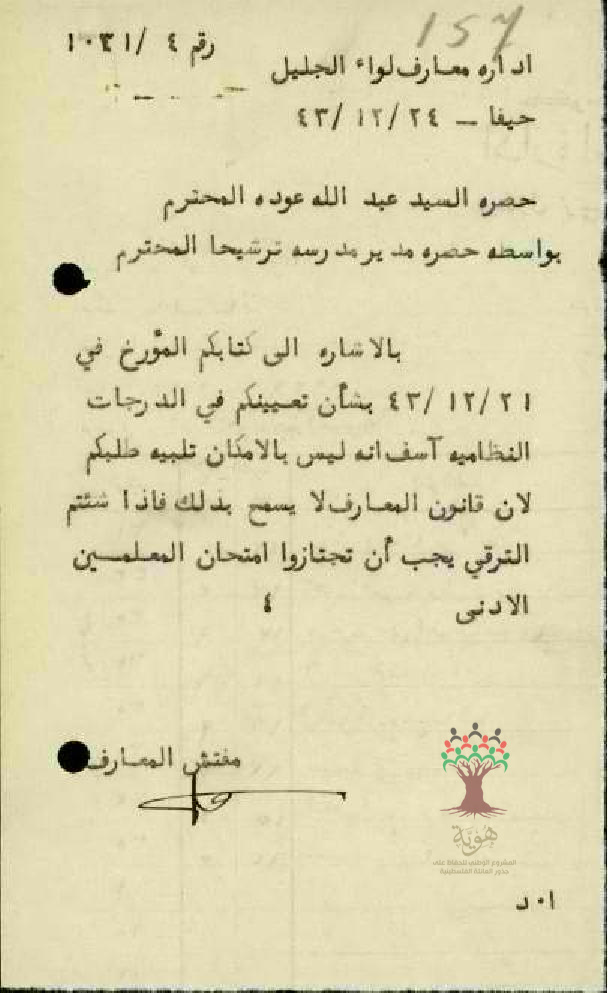 رسالة من مفتش المعارف الى المعلم عبد الله عودة بخصوص عدم امكانية تعيينه على الدرجات النظامية