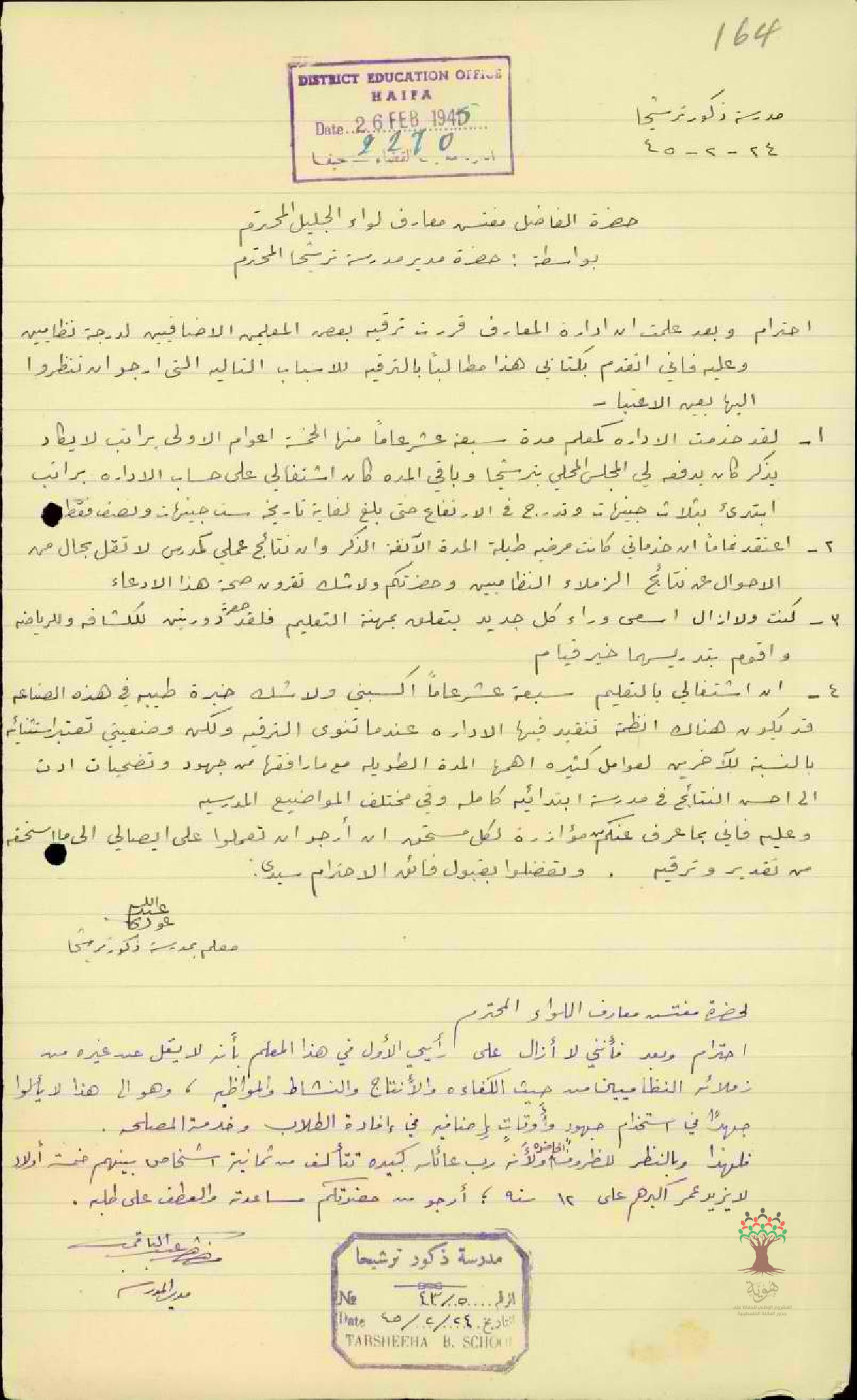 رسالة من المعلم عبد الله عودة الى مفتش المعارف يطلب فيها تعيينه نظاميا