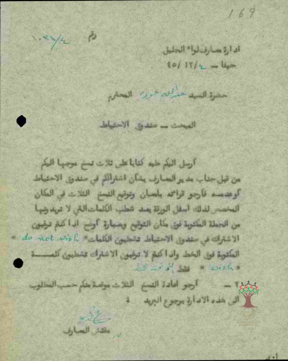 رسالة من مفتش المعارف الى المعلم عبد الله عودة بخصوص اشتراكه في صندوق الاحتياط