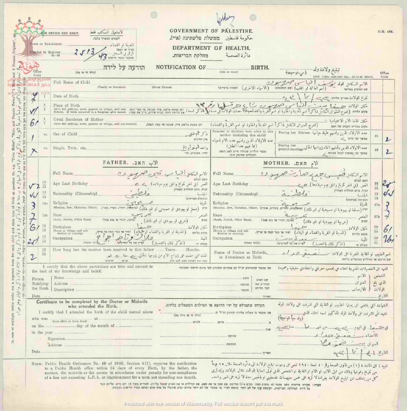 شهادة ميلاد يوسف الياس صهيون - حيفا