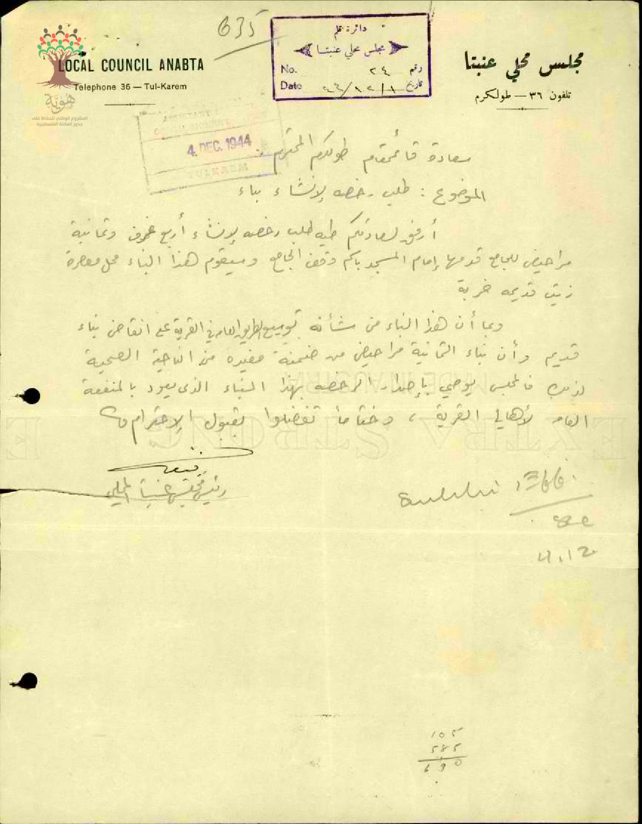 طلب رخصة بناء أربع غرف ومراحيض للجامع - رئيس مجلس عنبتا المحلي - عنبتا