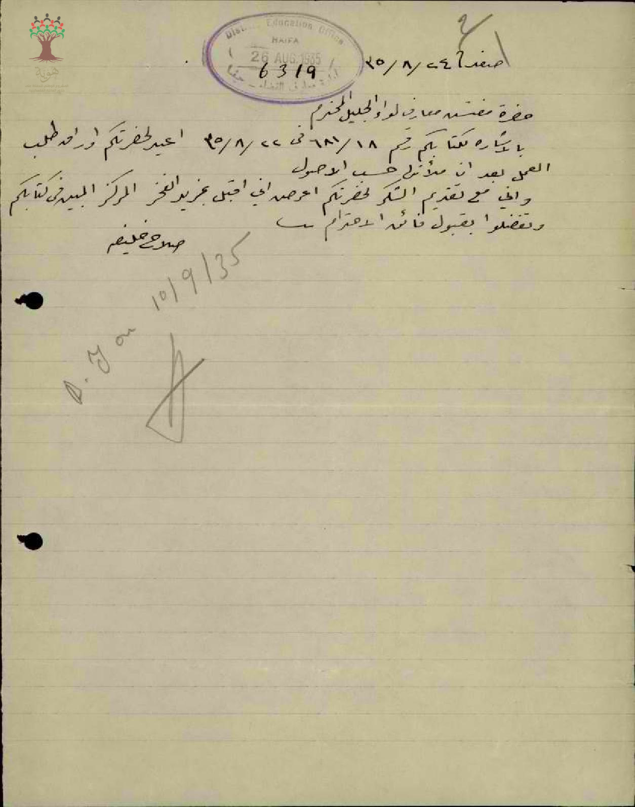 رسالة من المعلم صلاح خليفة الى مفتش المعارف يوافق على مركز معلم غير رسمي في مدرسة الجامع الأحمر