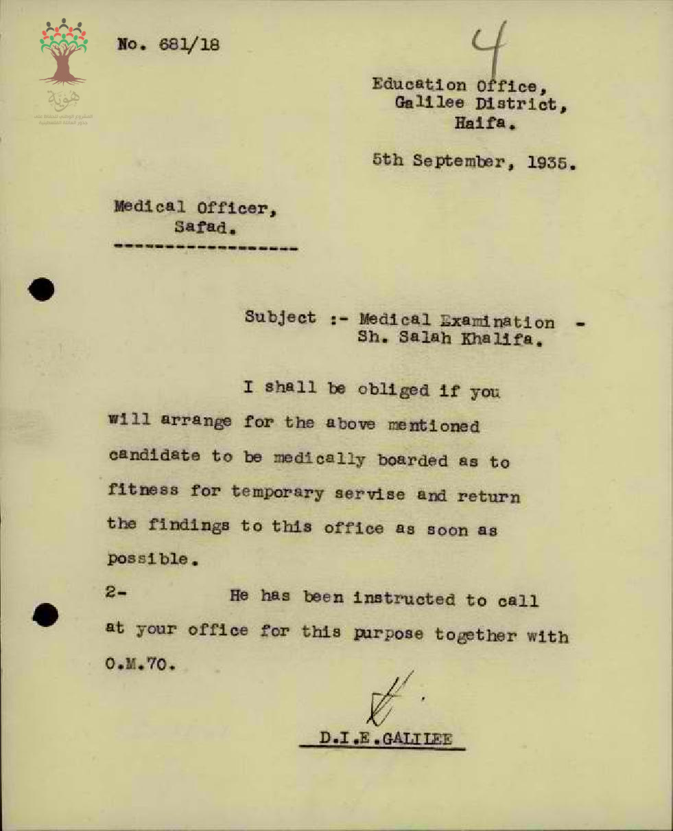 رسالة من مفتش المعارف الى طبيب الصحة لمعاينة المعلم صلاح خليفة لتعيينه