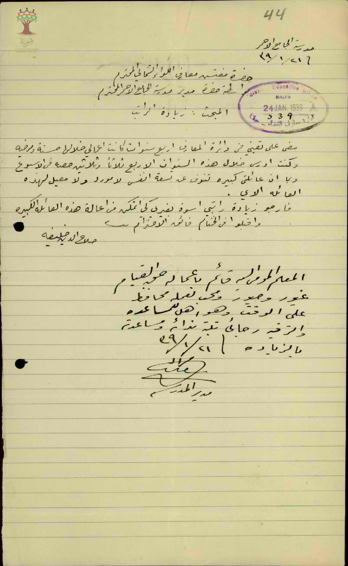رسالة من المعلم صلاح خليفة الى مفتش المعارف يطلب فيها زيادة راتبه