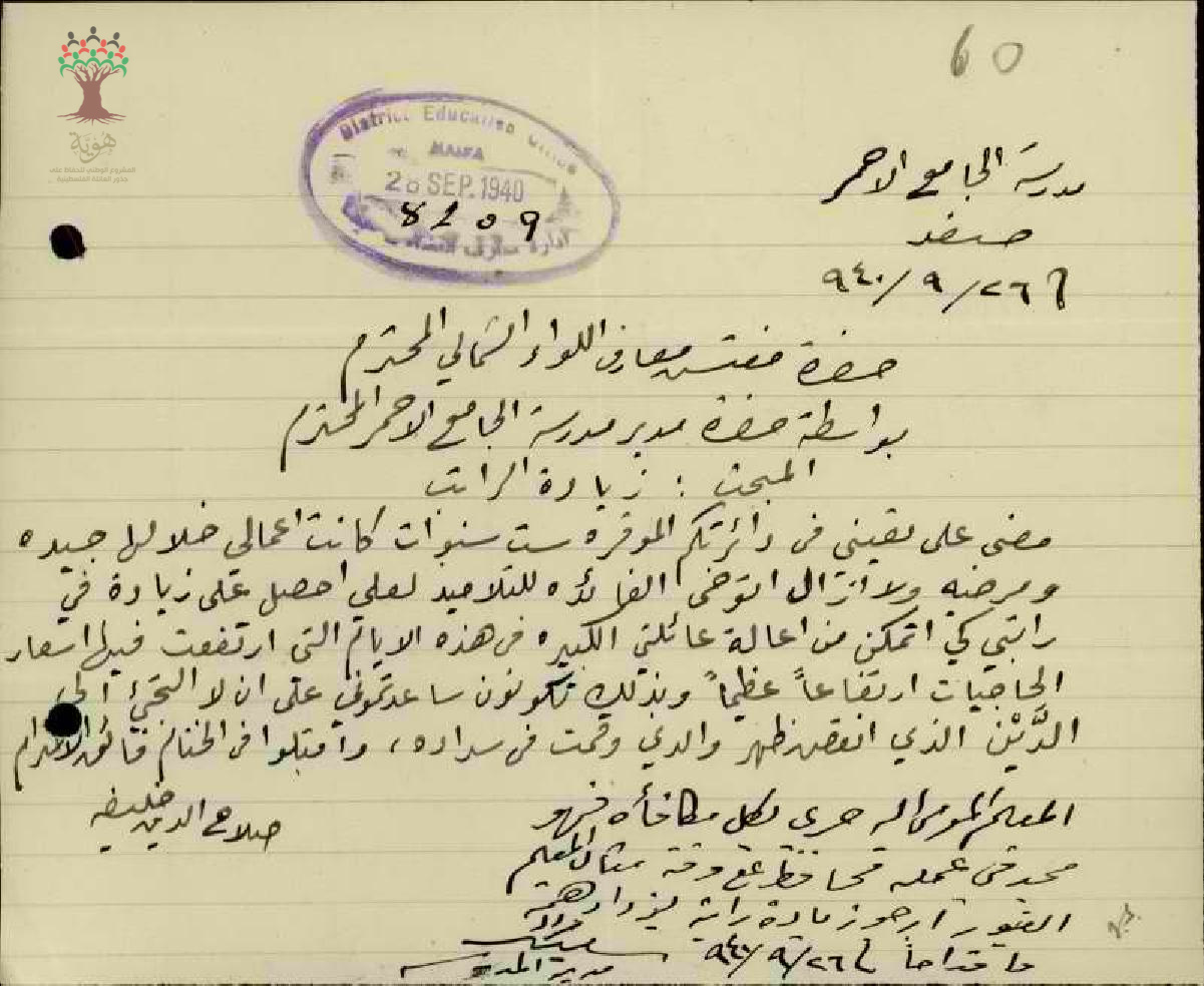 رسالة من المعلم صلاح خليفة الى مفتش المعارف يطلب فيها زيادة راتبه