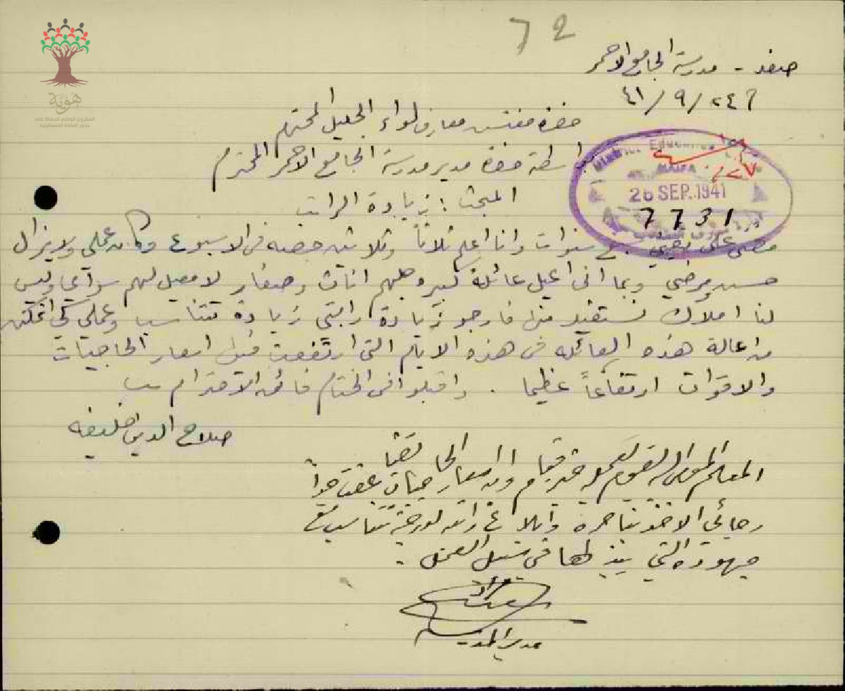 رسالة من المعلم صلاح خليفة الى مفتش المعارف يطلب فيها زيادة راتبه