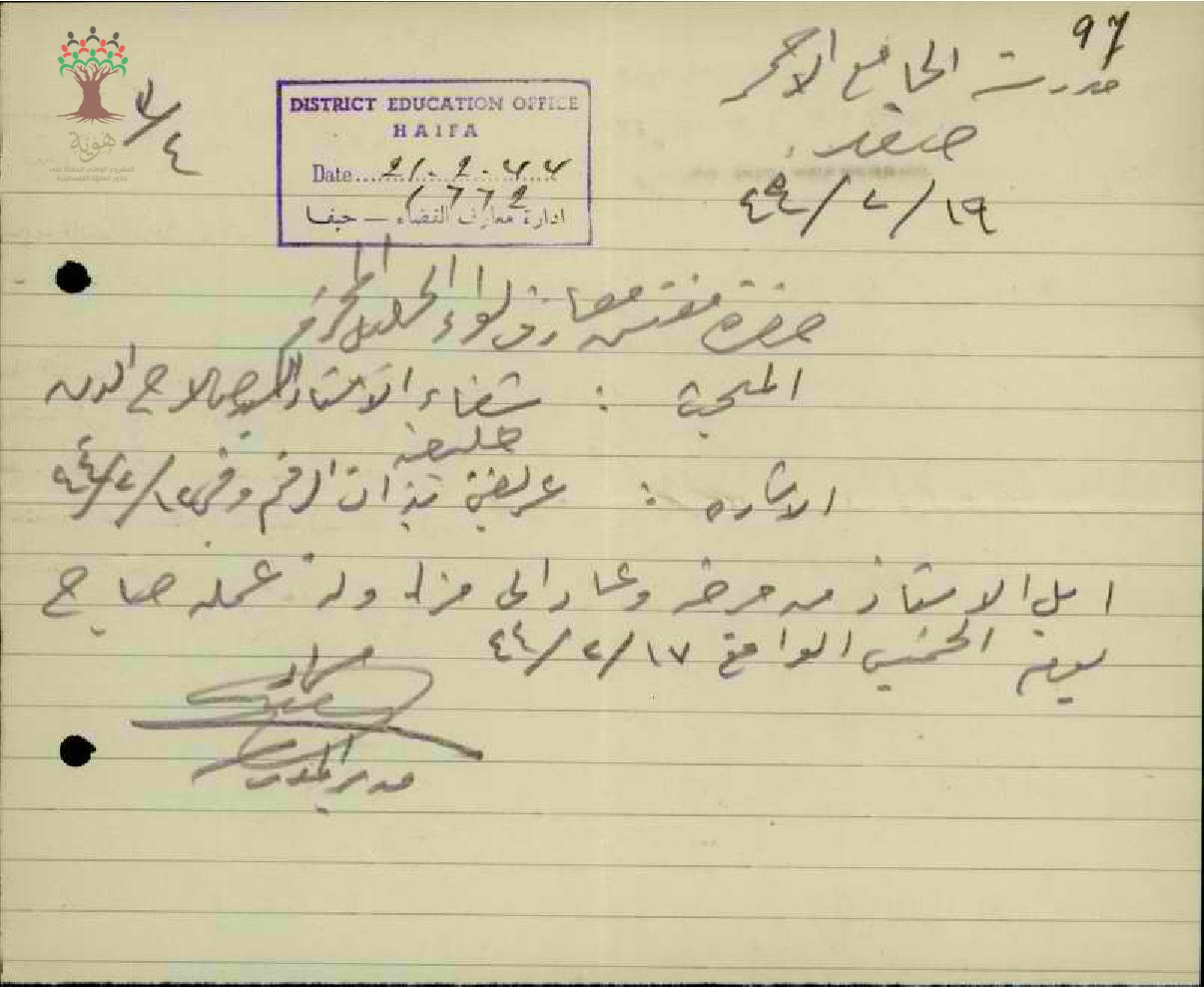 رسالة من مدير مدرسة الجامع الأحمر الى مفتش المعارف بخصوص عودة المعلم صلاح خليفة الى العمل