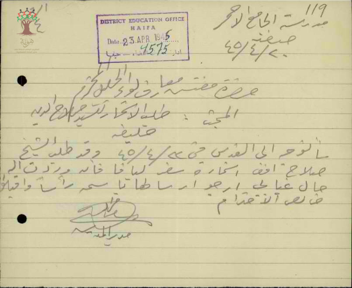 رسالة من مدير مدرسة الجامع الأحمر الى مفتش المعارف بخصوص استمارة سفر المعلم صلاح خليفة