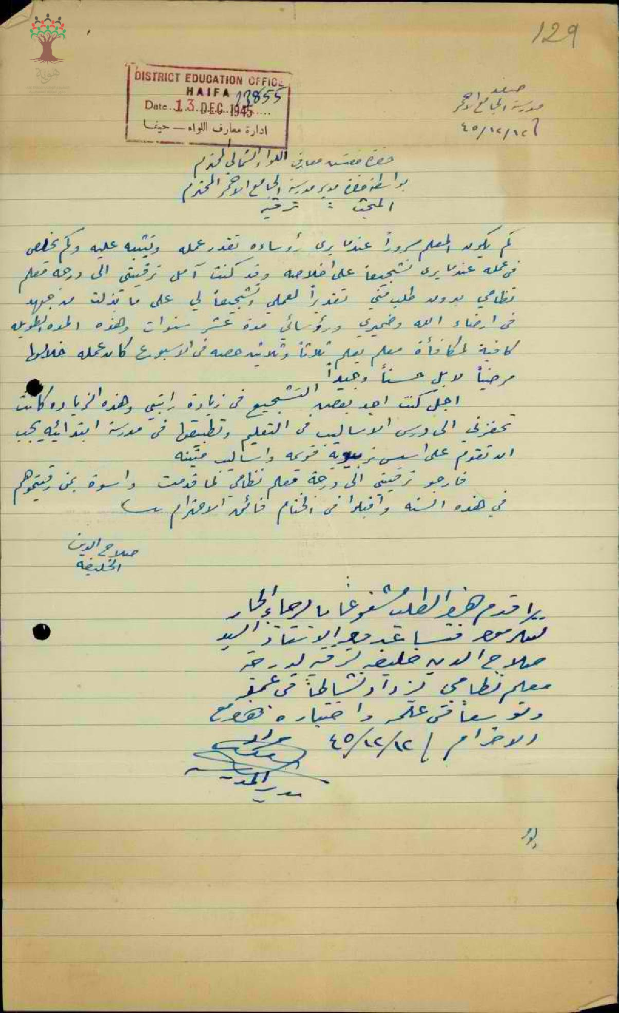 رسالة من المعلم صلاح خليفة الى مفتش المعارف يطلب فيها زيادة راتبه
