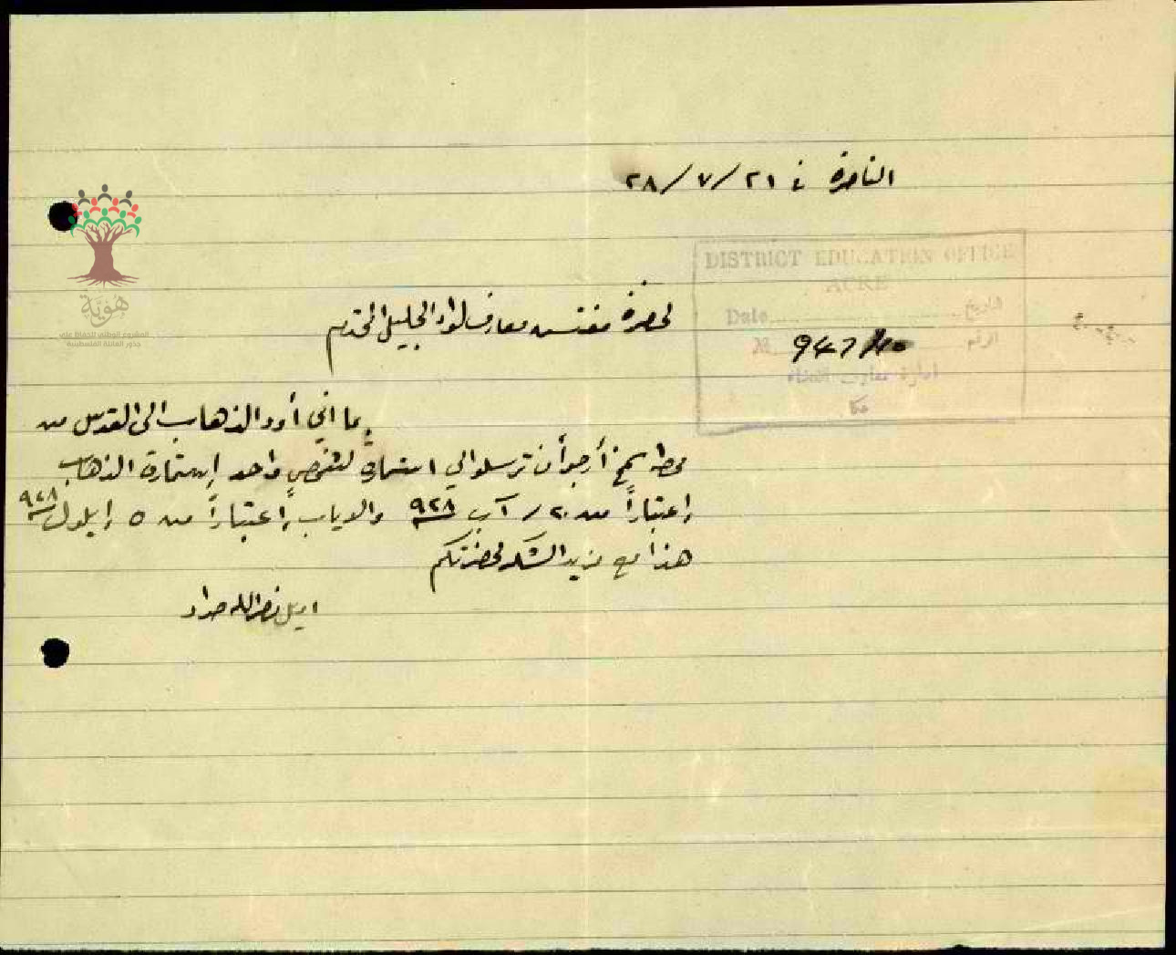رسالة من المعلمة أديل حداد الى مفتش المعارف تطلب فيها استمارة سفر
