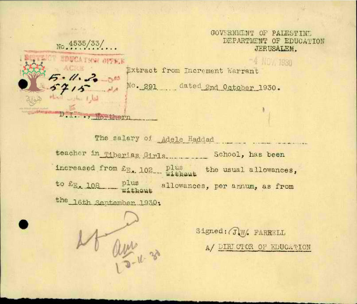 رسالة من مدير المعارف الى مفتش المعارف بخصوص زيادة راتب المعلمة أديل حداد السنوية