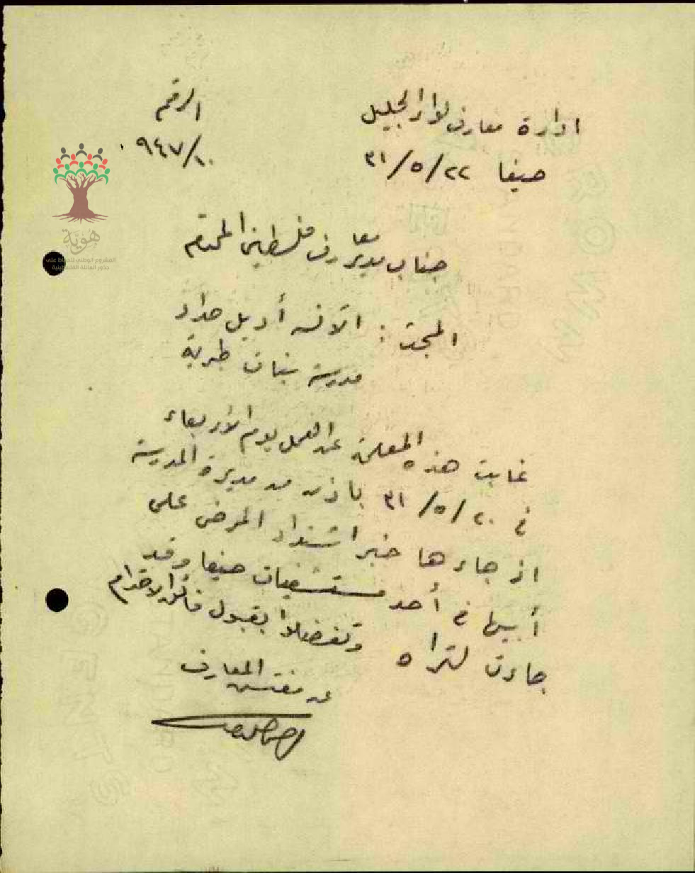 رسالة من مفتش المعارف الى مدير المعارف بخصوص تغيب المعلمة أديل حداد عن العمل بسبب مرض والدها