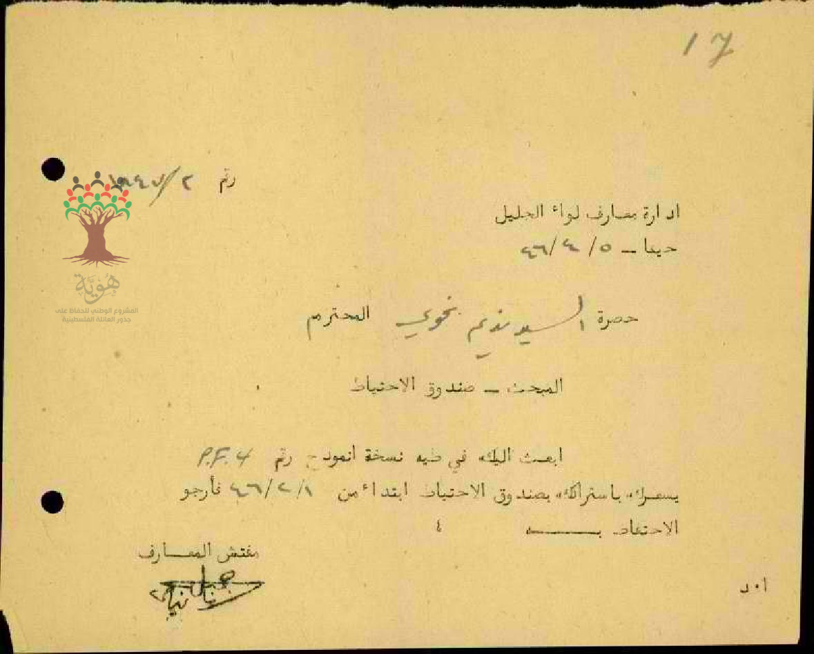 طلب الاشتتراك في الصندوق الاحتياط يمقدم من المعلم نديم النحوي -صفد - مدرسة عكا
