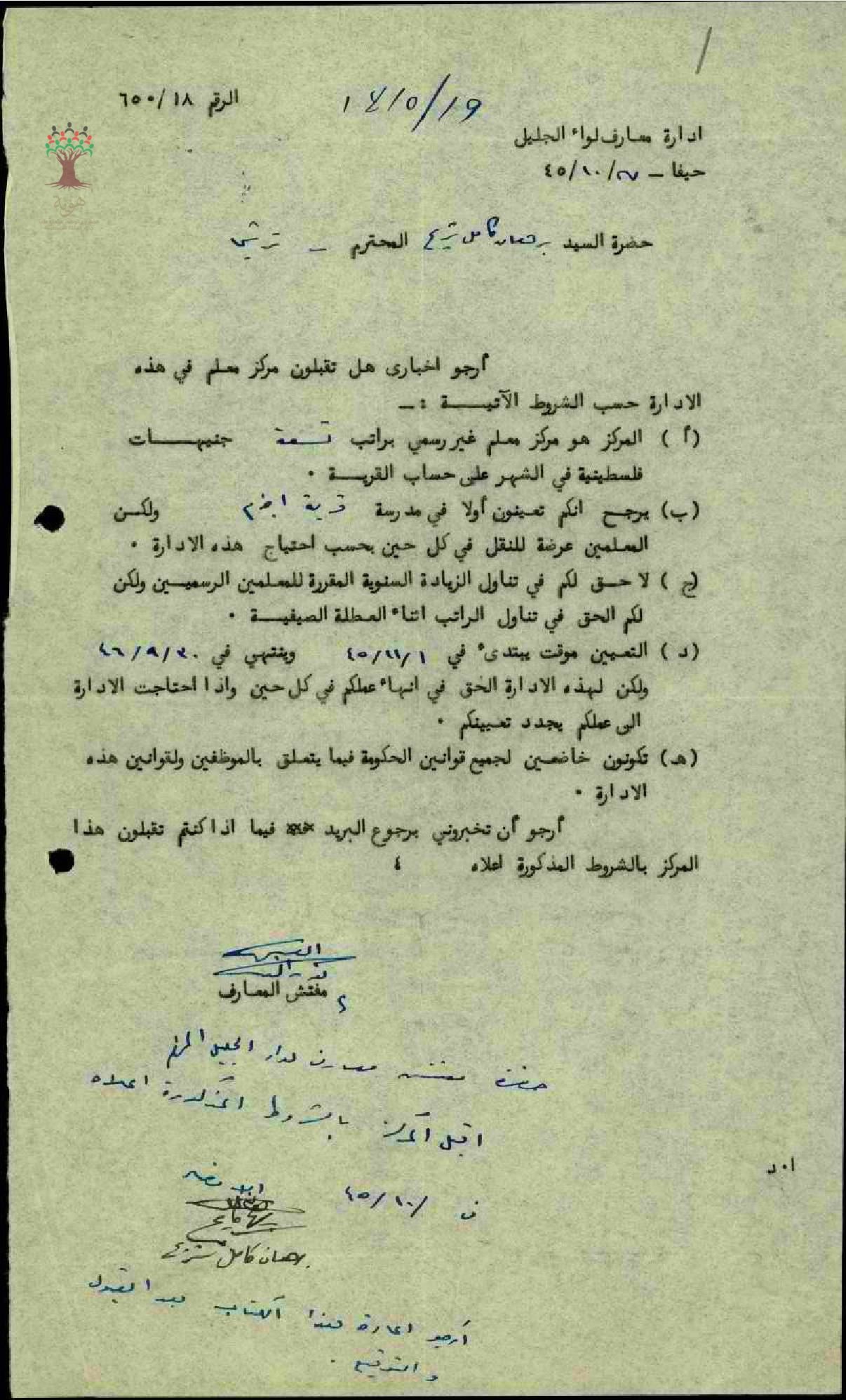 عرض من دائرة المعارف للسيد برهان شريح للعمل في مركز معلم غير رسمي براتب 9 جنيهات في قرية اجزم.. وموافقة السيد برهان