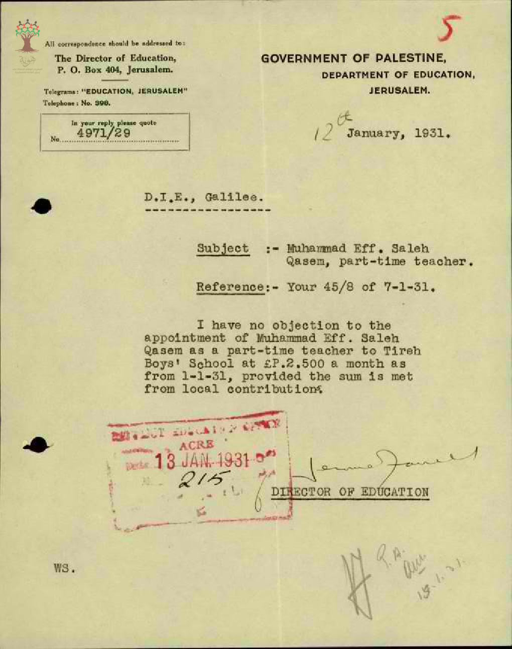 رسالة من مدير المعارف الى مفتش المعارف بخصوص تعيين المعلم محمد قاسم بدوام جزئي