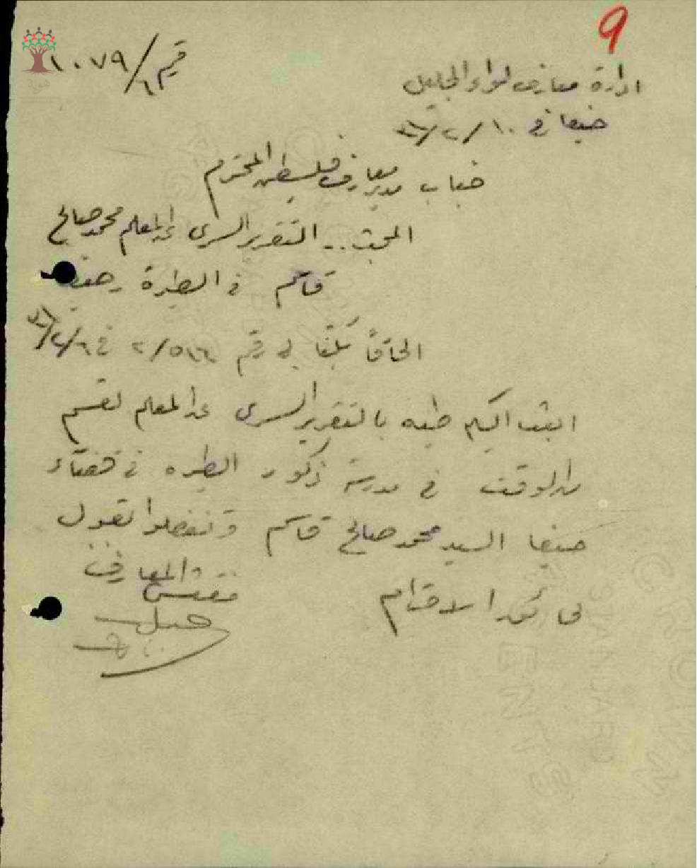 رسالة من مفتش المعارف الى مدير المعارف بخصوص التقرير التفصيلي للمعلم محمد قاسم